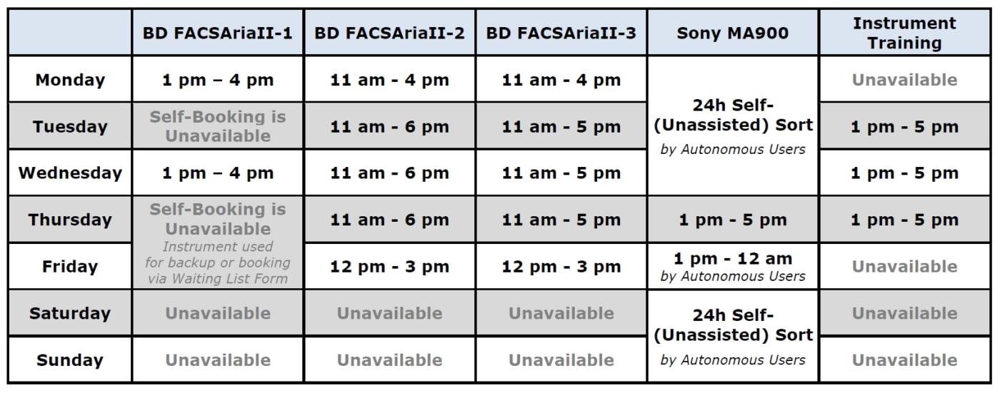 Cell Sorting and Instrument Training Schedule