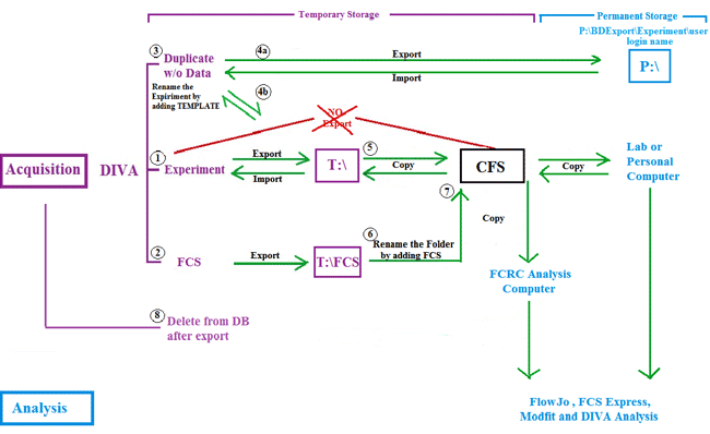 - Drive T: (Temporary) is created for commonly used temporary storage. All the data export should be directed through the new path – T:\ and T:\FCS on the BD LSRII computer. All the data left in T:\ and T:\FCS folders will be automatically deleted weekly. No limits for the folder sizes will be implemented there (other than actual disk space availability). To avoid problems, being exported from the BD FACSDiva Browser/Database, Experiment or FCS folders should be immediately transferred to your CFS Folder.
