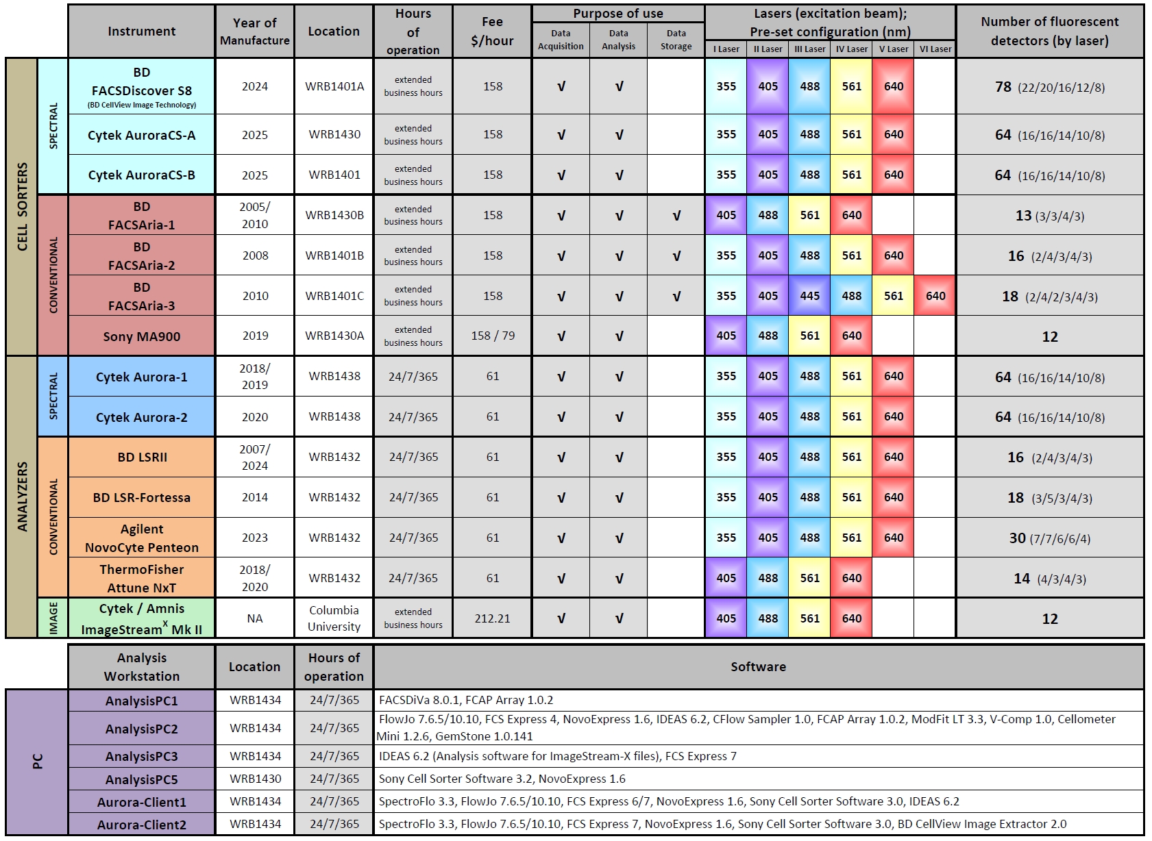 After orientation trainings (Virtual Classroom, “Beyond the Basics” Class, Pre-Hands-On Consultation and Instrument Hands-On Training), Cytek Aurora, BD LSRII, BD LSR-Fortessa, Agilent NovoCyte Penteon and ThermoFisher Attune NxT are available for use directly by the investigators.