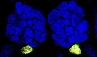 Nerve gas. In a fly’s brain (blue), highlighted areas show where neurons expressing two proteins, Gr21a and Gr63a, converge. Scientists have shown that these proteins are necessary in order for the fly to detect carbon dioxide.