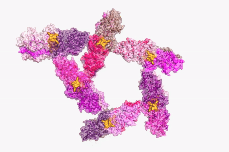 Cat1 monomers seen here in shades of pink and purple, while cA4 glueing the dimers to extend the filament are in orange. (Courtesy of Marraffini lab)