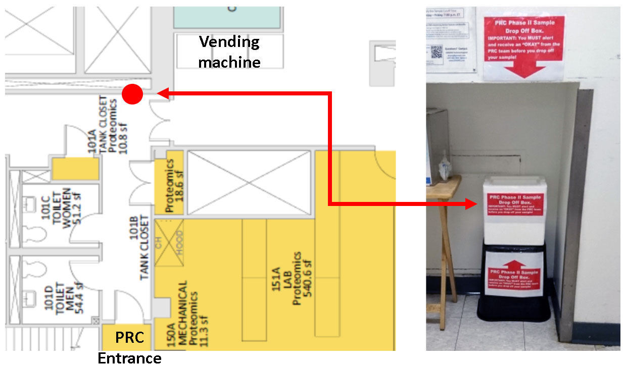 Internal user sample drop-off: 1st fl. of RRB. Zero-Contact Sample-Drop-Off for the PRC.