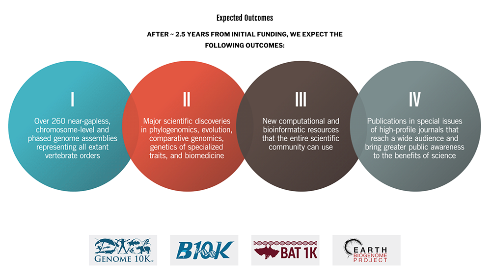 The Vertebrate Genomes Project (VGP) aims to generate error-free reference-quality genome assemblies representing all 70,000 vertebrate species. Genome assemblies are a map of an organism’s genes, which determine that organism’s characteristics. Understanding the DNA sequence similarities and differences between all vertebrates will enable the study of how genes have contribute to the evolution and survival of these species. Broadly, we expect that the VGP will provide a powerful resource to advance questions in biology, genomics, conservation, medicine, and bioinformatics.